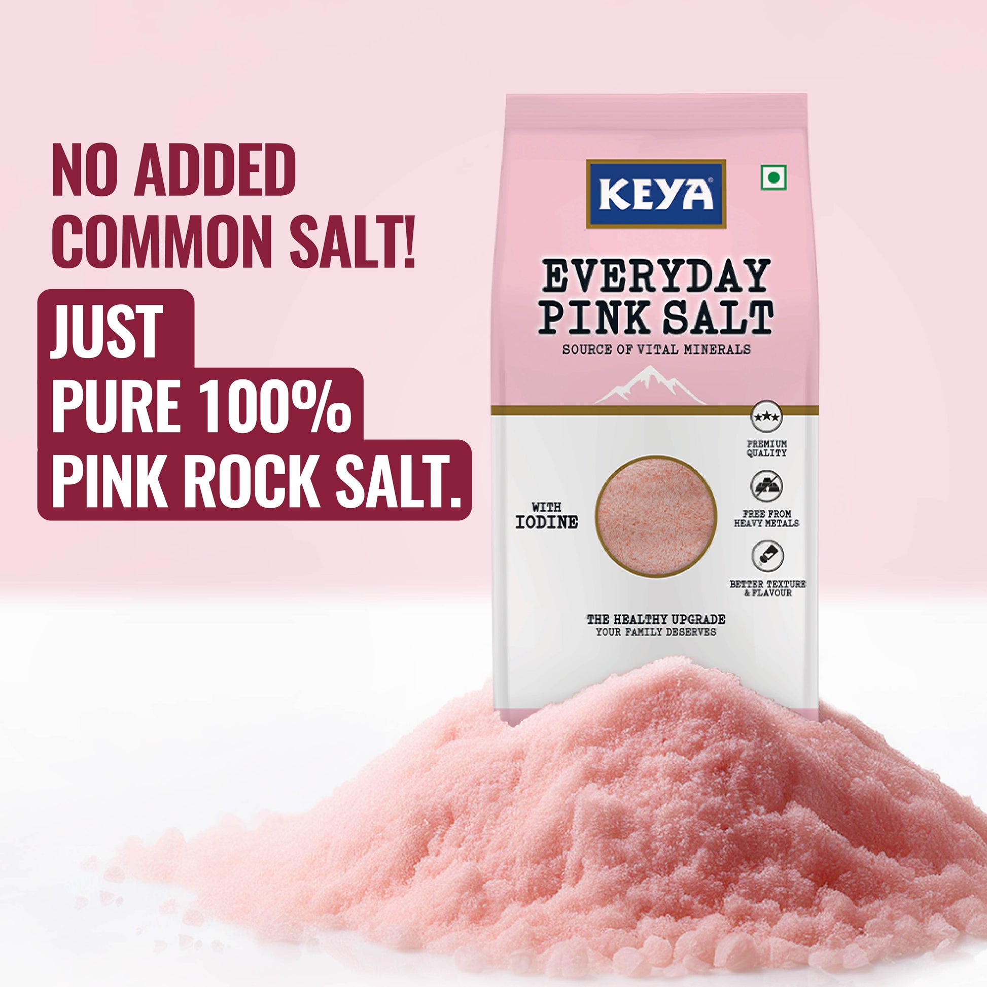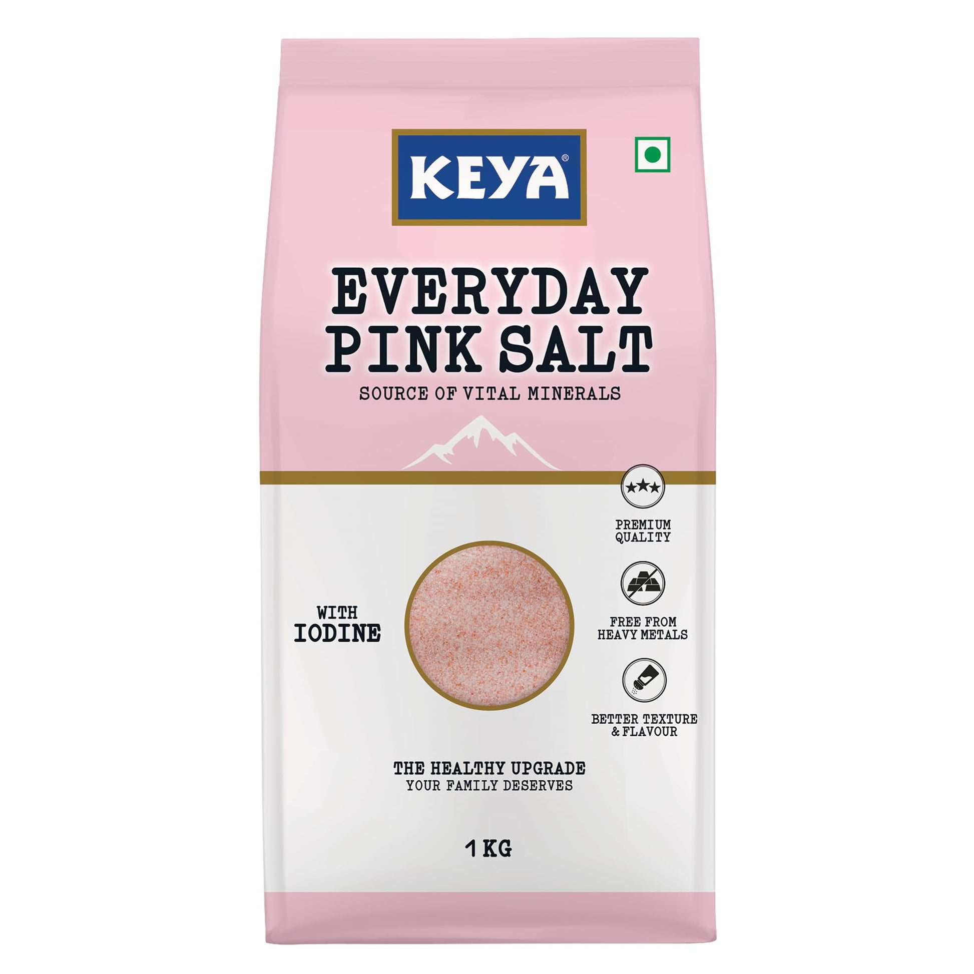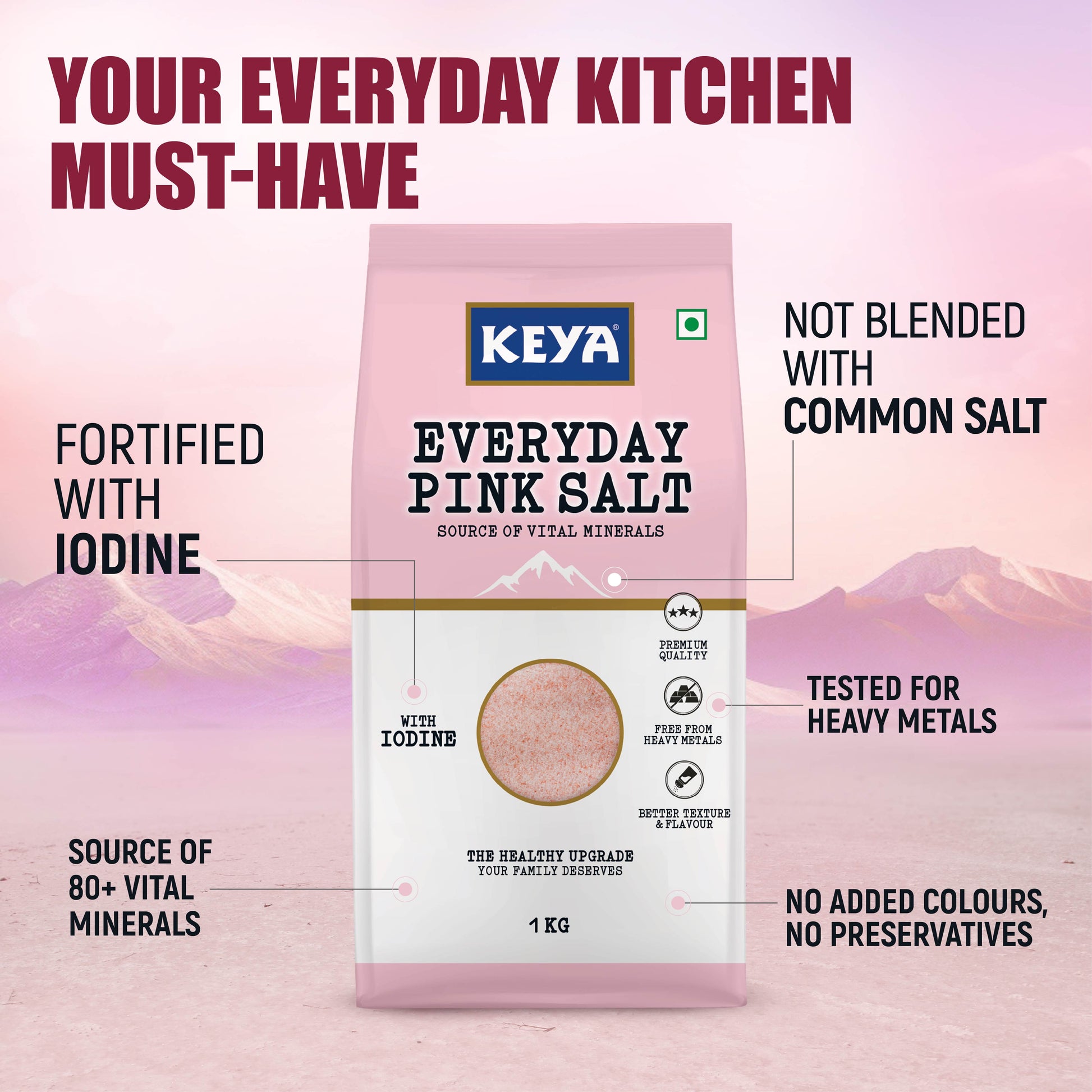 1) Keya Everyday Pink Salt is a daily kitchen must-have tested for heavy metals, packed with 80+ essential minerals and fortified with iodine.