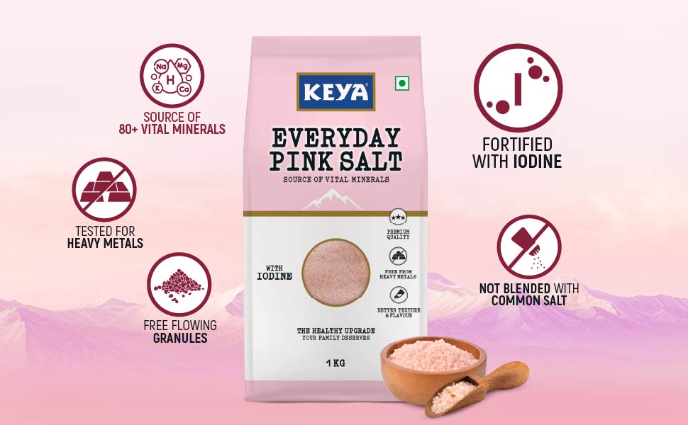 1) Keya Everyday Pink Salt is a daily kitchen must-have tested for heavy metals, packed with 80+ essential minerals and fortified with iodine.
